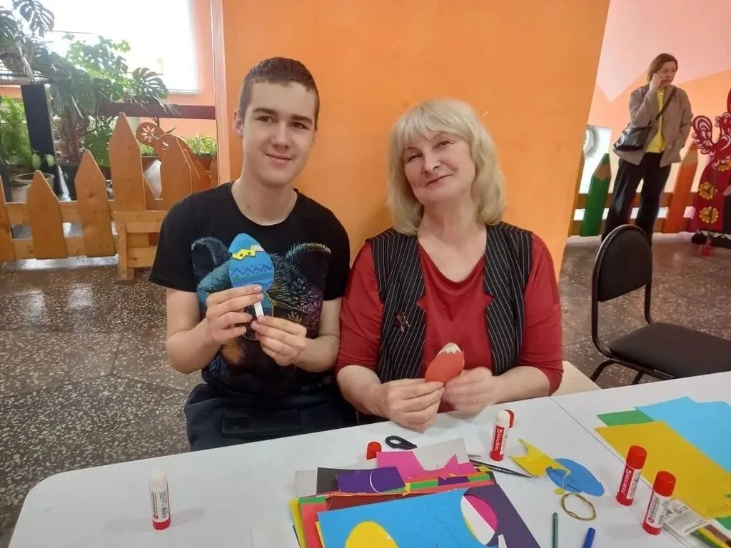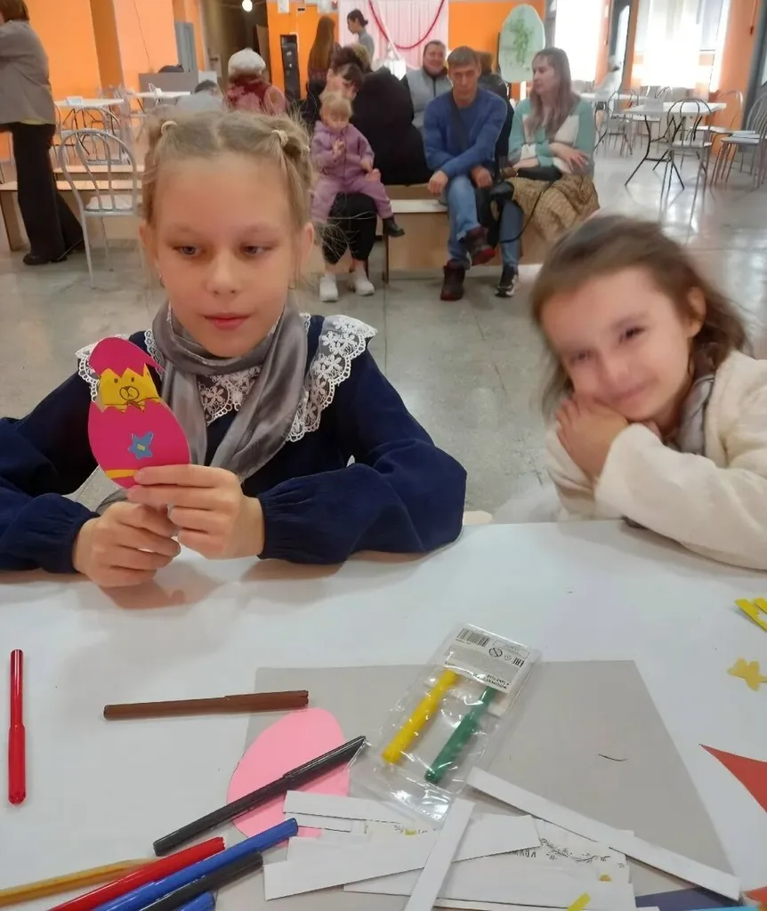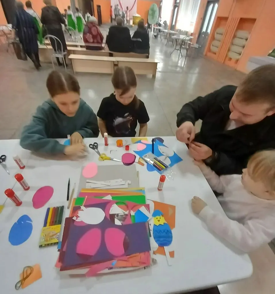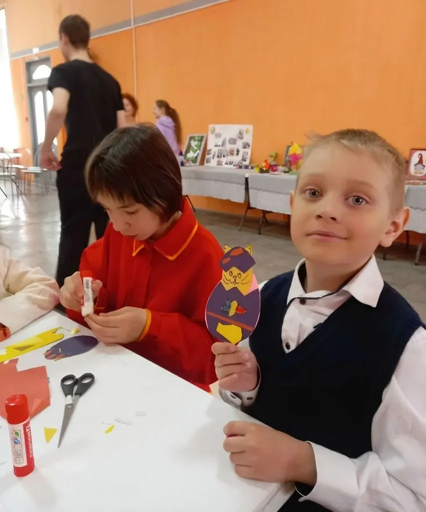 Преподаватель художественной школы №12 Медведчикова Елена Николаевна провела для присутствующих ребятишек мастер-класс по изготовлению интерактивного яйца-сюрприза из бумаги. Дети вырезали заготовки из цветной бумаги, склеивали детали и расписывали узорами. Внутри яйца мог спрятаться любой герой - цыплёнок, котёнок или зайчик.